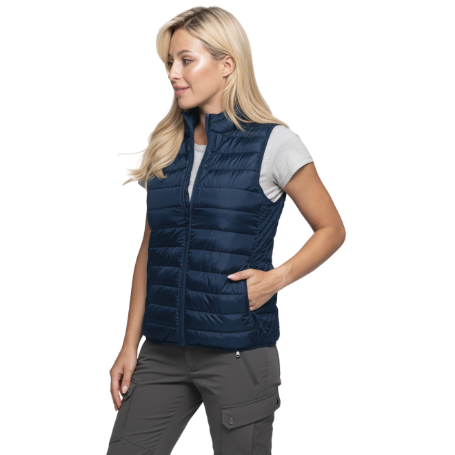 Елекът разполага с централно закопчаване с найлонов цип, както и с два предни джоба с ципове с удължители, осигуряващи лесно боравене дори с ръкавици. От вътрешната страна са предвидени два вътрешни джоба, подходящи за телефон, документи или други лични принадлежности. Изчистеният тъмносин цвят (navy) придава елегантна визия и позволява лесно комбиниране с различни стилове облекло.