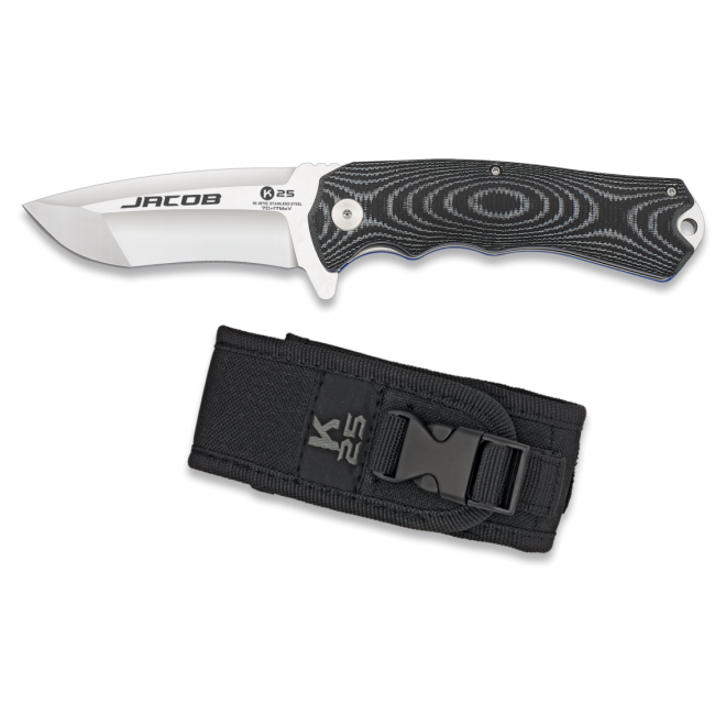 Този масивен и стилен сгъваем тактически нож на испанската компания K25 е чудесна комбинация от ефектна визия и висока функционалност. Моделът Jacob 18715 е с острие изработено от неръждаема стомана 7Cr17Mov с дължина от 88 мм и дебелина от 3,15 мм. Формата на клина е тип drop point, а острието е с прав режещ ръб. Изработката е много прецизна и всеки детайл е изпипан. Ножът е снабден с механизъм позволяващ бързо и лесно отваряне само с една ръка. Това е особено важно предимство в екстремни ситуации, когато е необходима бърза реакция и всяка секунда е от значение. При разгръщане на острието до край, то се фиксира и заключва на позиция посредством механизъм тип Liner lock. Ножът има и масивен гард, който ще предпази пръстите от приплъзване към острието при голямо напрежение. Ръкохватката е изработена от висококачествен, здрав и износоустойчив полимер G10. Тя има ергономична форма и пасва идеално в ръката. В долният край на ръкохватката е разположен отвор позволяващ поставяне на паракорд връзка за допълнително подсигуряване. Към ножът получавате и стилен черен тактически джоб за пренос и съхранение. Той е снабден с MOLLE система и дава възможност за прикачане на съвместима екипировка, както и за носене на стандартен колан.